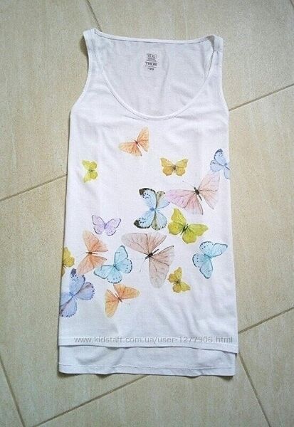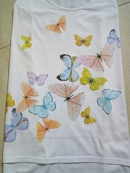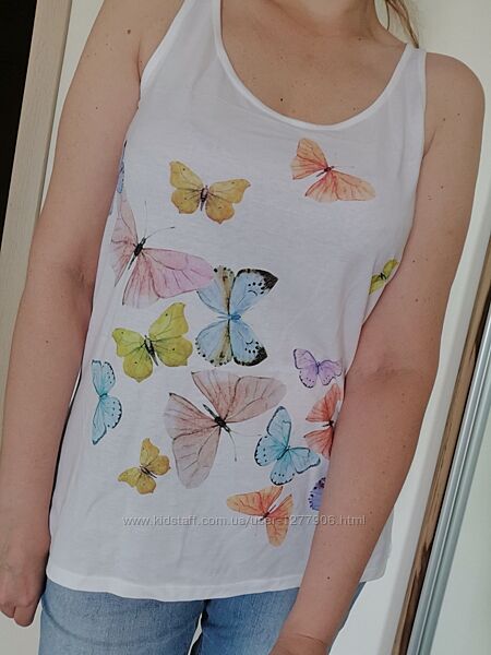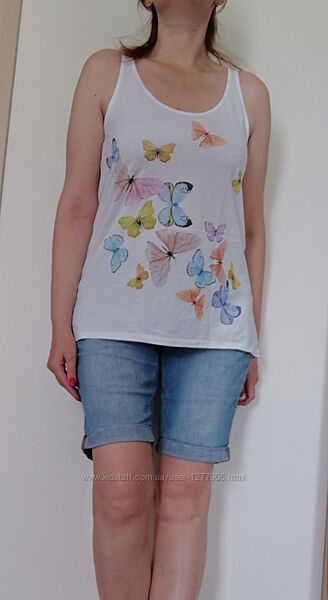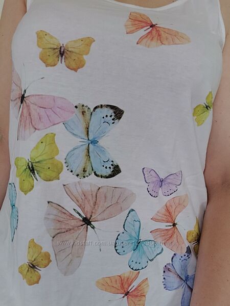 Женственная летняя майка с ярким принтом разноцветных бабочек, дополнит Ваш романтичный образ. Приятная к телу ,легкая из 100% хлопка . Размер 50/XL (можно как оверсайз) Замеры: ПОГ - 50 см К низу слегка расклешена . Длина перед - 50 см Длина по спинке - 75 см --- Доставка: Предоплата 100% Новая Почта. Без торга, возврата, обмена.