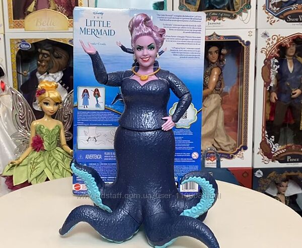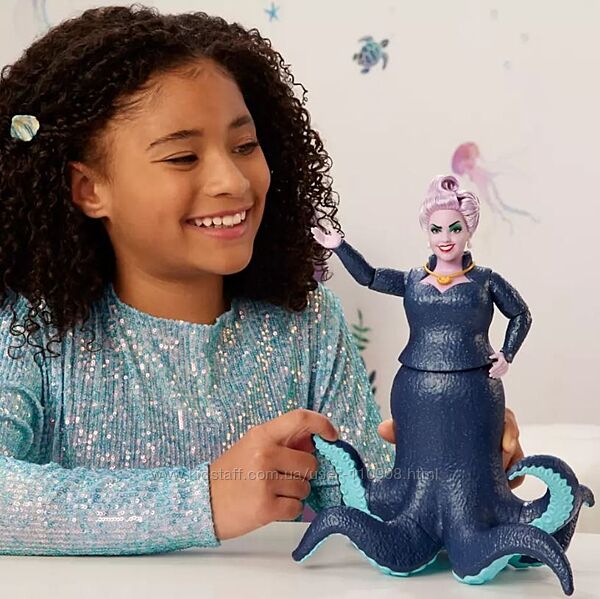 Кукла Урсула по фильму "Русалочка" 2023.Кукла Урсула представлена в аутентичном образе со щупальцами, съемным аксессуаром в виде ожерелья и блестящими деталями повсюду!