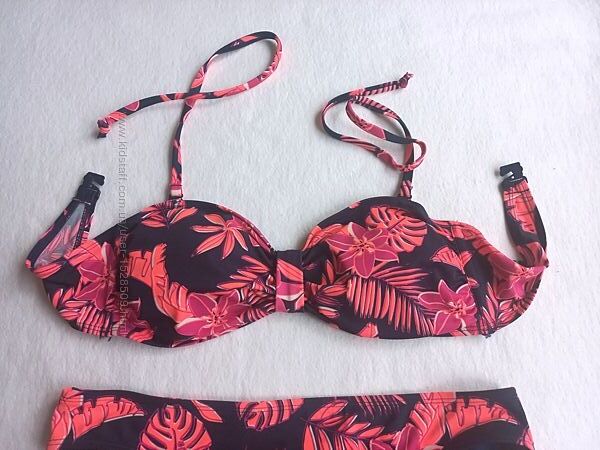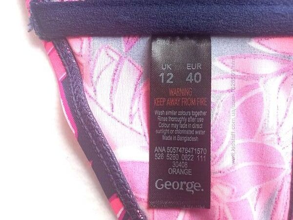 Роздільний купальник, від George. 81% поліамід, 19% еластан. Колір комбінований: на темно-фіолетовій основі тропічні рослини неонового персикового та малинового кольору. Чашки ліфчика мають поролонові вкладки. Уживаний пару разів акуратно, стан відмінний, дивиться фото.Верх та низ різного розміру!