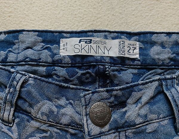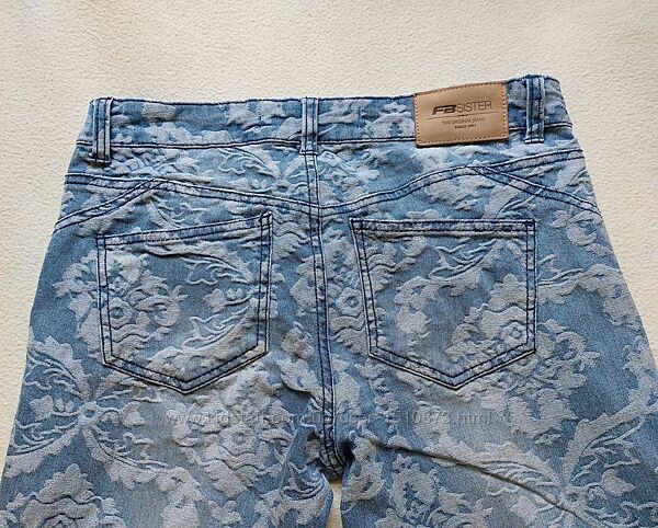 Продам стильные женские джинсы скинни с принтом бренда FB Sister в идеальном состоянии. Размер W27. Куплены во Франции, в магазине New Yorker. Одевались несколько раз, после деликатной стирки.Джинсы светло-синего цвета с эффектом "потертости". Посадка - высокая. Хорошо тянутся, стрейтчевые. Подойдут на стройную девочку/девушку среднего или высокого роста. Садятся шикарно, подчеркивая попу и фигуру. Причина продажи - больше не подходят по размеру.