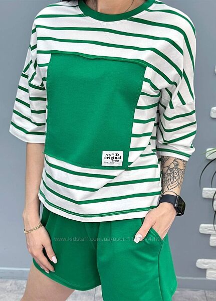Простора смугаста футболка пошита з турецького куліру – якісної тканини, що на 95% складається з бавовни. Матеріал забезпечує хорошу вентиляцію, добре вбирає вологу і приємний до тіла. Завдяки вільному крою він драпірується навколо силуету м´якими складками. Шорти виготовлені із трикотажу двонитки. Цей матеріал міцний, зносостійкий та простий у догляді.