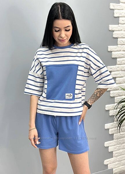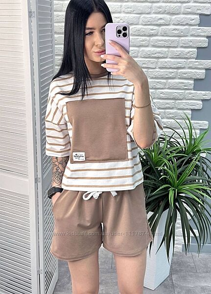 Костюм-двійка складається із вільної футболки та шортів. Спортивний стиль та вільний крій – запорука комфорту володарки костюма.