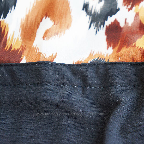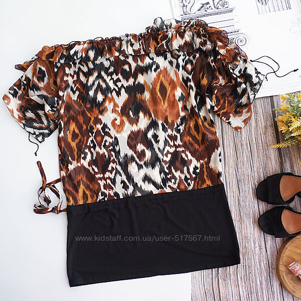 Эффектная туника с рюшем и шнуровкой на плечах. Верх туники яркой анималистичной расцветки. Низ - из контрастной черной трикотажной ткани позволяет регулировать длину. На боку есть декоративные завязки. Модель расширяет верхнюю часть фигуры и сужает визуально бедра.