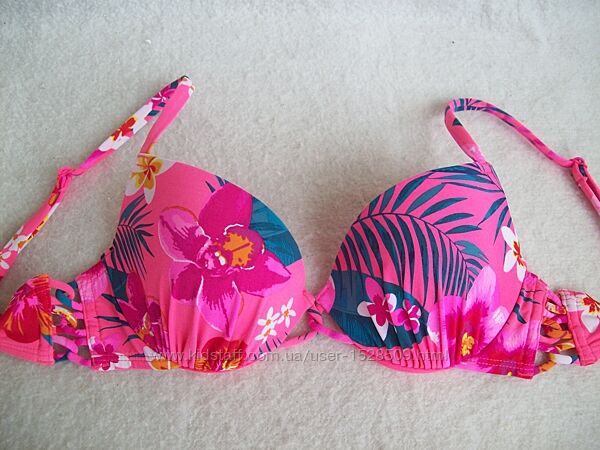 Пропоную яскравий роздільний купальник з тропічними квітами. Чашки ліфчика з ущільненням. Уживаний 1 раз акуратно, стан відмінний, дивиться фото.Висота трусиків по середині 25 см, ширина талії 38 см, тягнеться до 48 см.