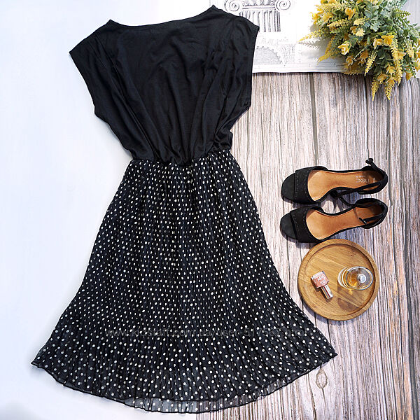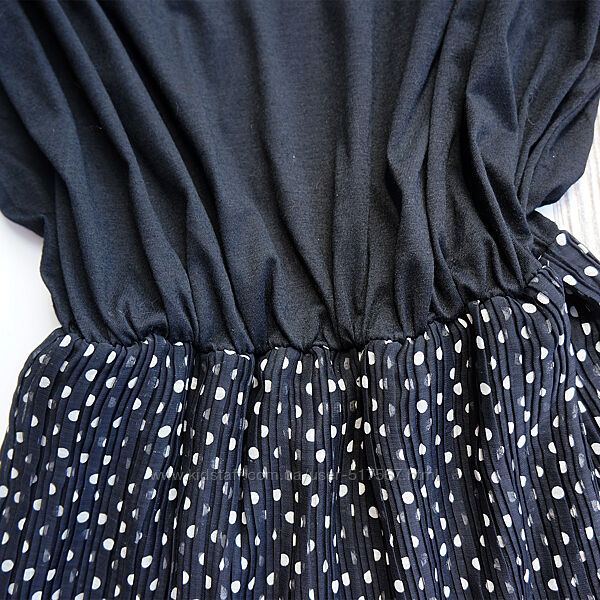 Трикотажный верх с вырезом лодочкой из трикотажа, а низ из плиссированной ткани в модный горох