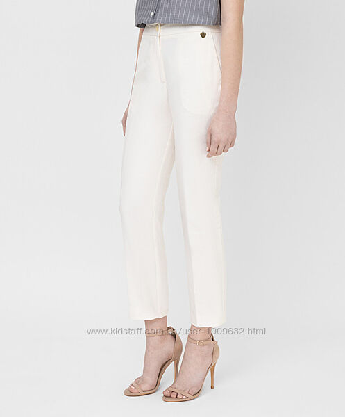В наявності дуже класні легенькі льняні брючки від італійського бренду Twin Set!Вузькі брючки Twin Set із запрасованими стрілками. Модель виконана із сумішевого льону кремового кольору. Застібка на блискавку та гудзик.