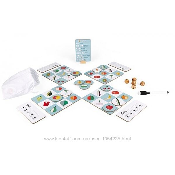 2. Лото "Овощи". Развивающая настольная игра является вариацией на тему классической игры.Красочный дизайн придется по вкусу малышам, а эффективность и польза таких занятий доказана поколениями. В процессе развивается стратегическое мышление, внимательность и логика. Комплектация: 36 игровых фишек, 5 игральных костей, 4 карточки-поля для заполнения, холщовый мешочек, маркер, инструкция. Возрастная категория 5+. Страна-производитель: Франция. Цена: 450 грн.