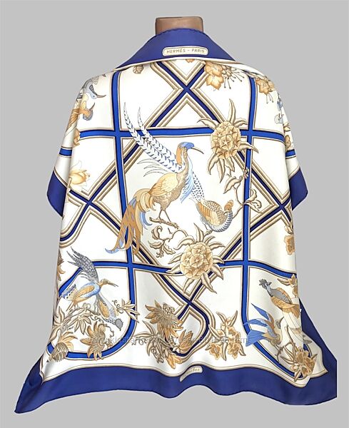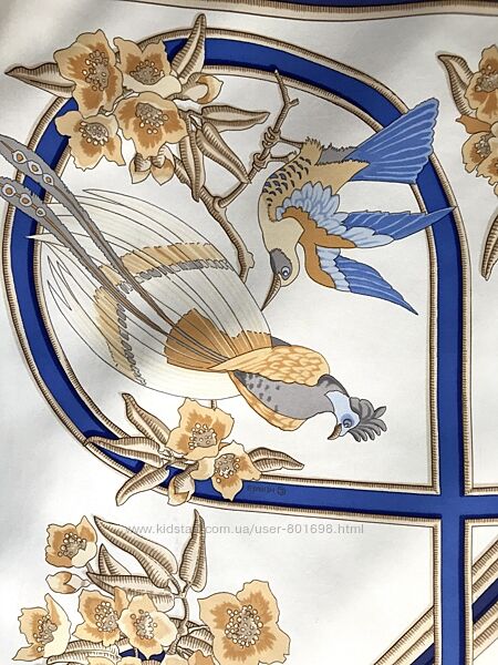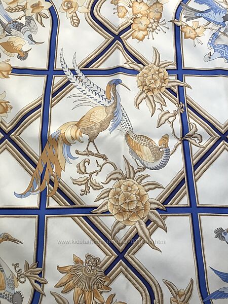 Люксова шовкова хустка HERMES PARIS CARAIBES by Christiane Vauzelles, 1991.Ця неймовірна хустка Hermes відрізняється екзотичним і красивим дизайном Райських птахів. Унікальне твір мистецтва відомого дизайнера Крістіана Ваузеллеса. Спочатку випущений в 1974 році, цей рідкісний шарф був тільки перевиданий один раз в 1991 році Більшість робіт Christiane Vauzelles не мають підпису.