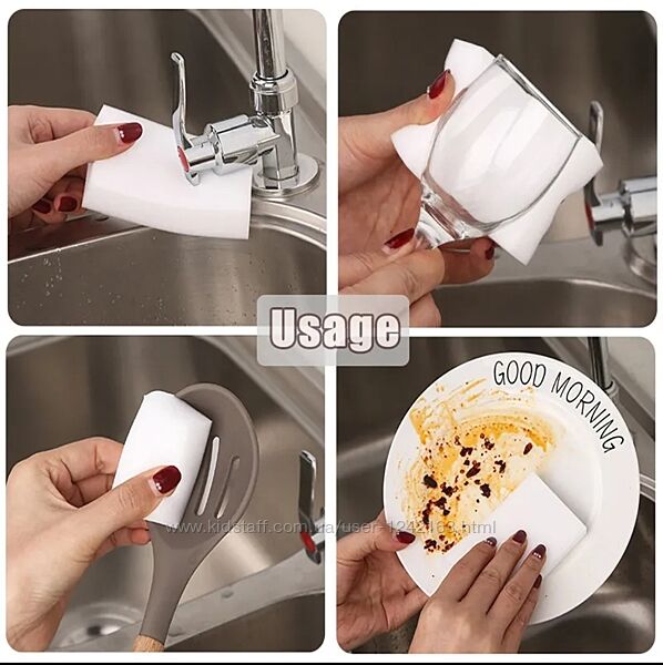 Перемагає навіть найважчі плями. З легкістю прибирає та очищає бруд у всіх куточках будинку: пластикові поверхні, кераміка, мармур, граніт, стіни, пічки, духовки, плити, холодильники, шкіра, садові меблі, інтер´єр машини тощо… Не потрібно побутової хімії. Просто намочіть губку водою, вичавіть – і чистіть!