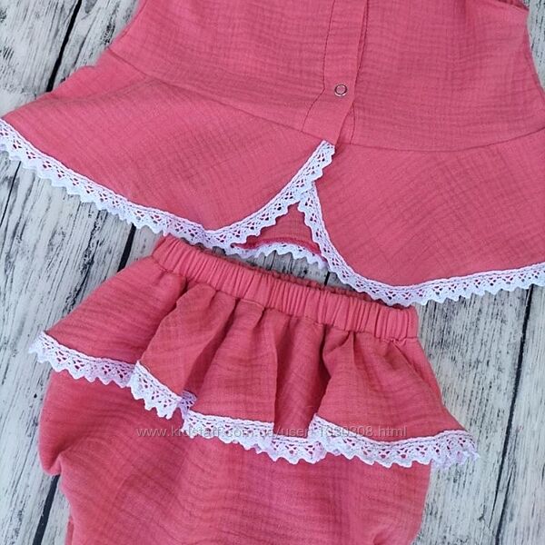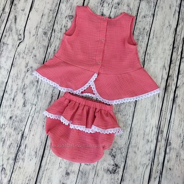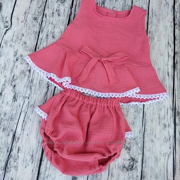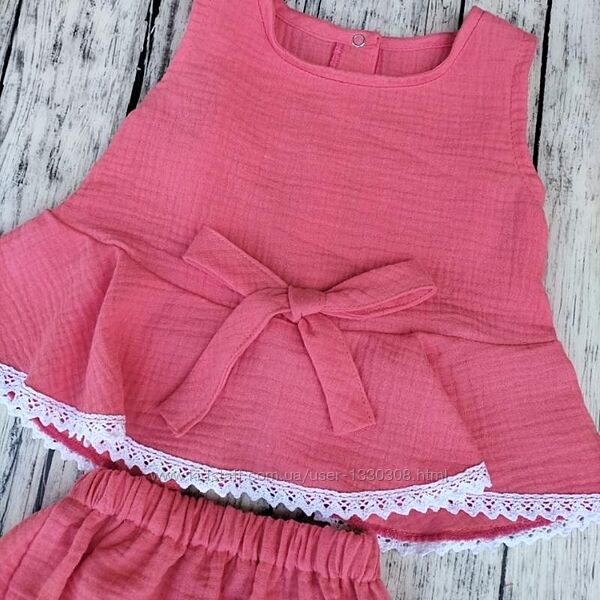 Гарненький мусліновий костюм. Натуральна м´яка тканина. Для літньої погоди буде чудово. Трусики на резинці. Спинка туніки на кнопках. В наявності розмір 86-92 Трусики: пояс 18,5 см, висота 24 см Туніка: плечі 23 см, ПОГ 30 см, довжина по спинці 33 см Відправка можлива Укрпоштою та Новою поштою