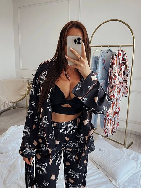 Костюм складається з кофти на запах під пояс та штанів високої посадки на резинці. Є кишеніТканина – шовк