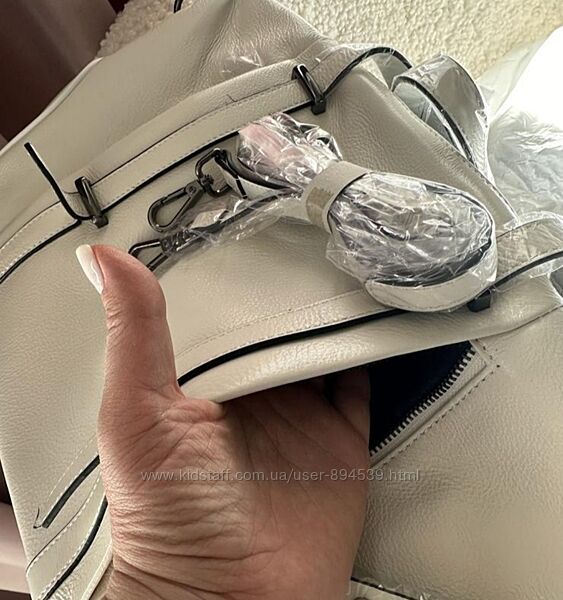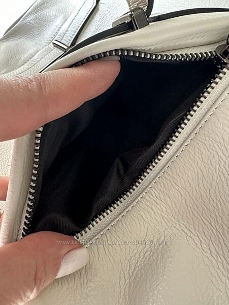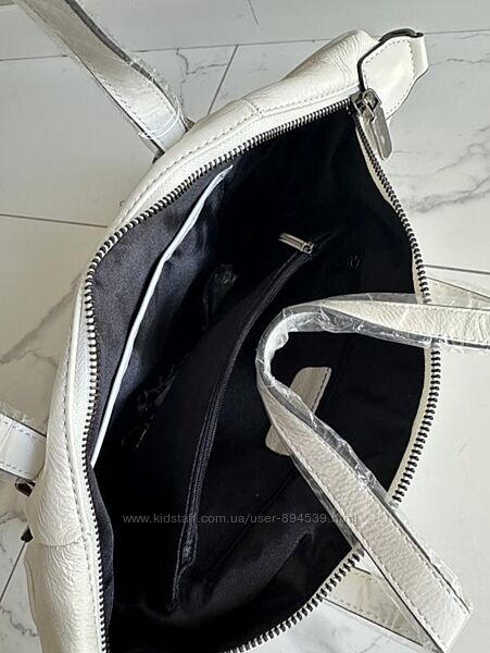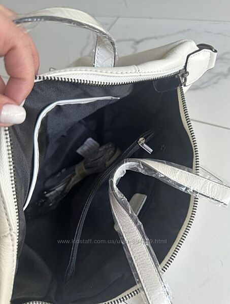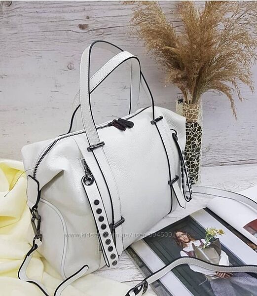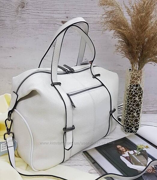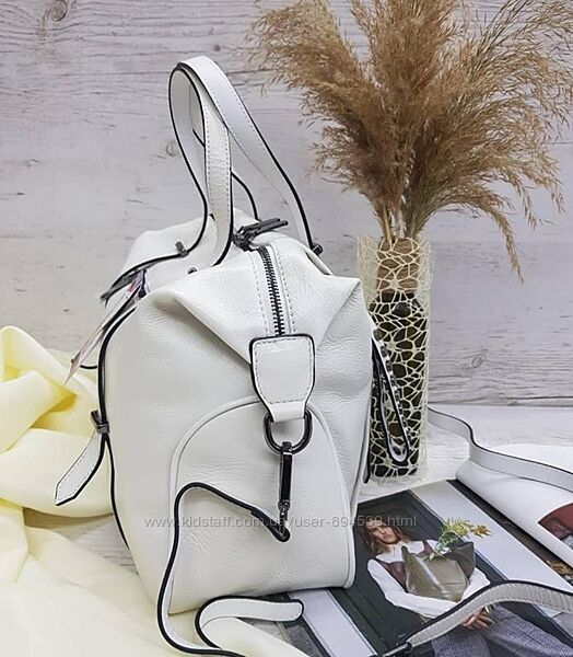 Женская кожаная сумка среднего размера белого цвета с двумя ручками закрывается на металлическую молнию. Внутри два отделения; основное большое и маленькое разделены карманом перегородкой на молнии, также есть врезной карман на молнии и накладной карман для мелочей. Внешне впереди два кармана на металлических молниях и сзади есть карман на металлической молнии. Дно сумки защищено металлическими ножками. К сумке идет длинный ремешок для плеча. Производитель: Китай.Размеры: 35 х 30 х 12 см.