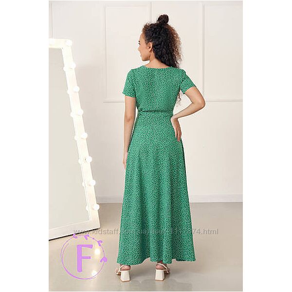 Модель з довжиною максі має глибокий V-подібний виріз на запах, короткий рукав і розкльошену нижню частину. Фіксується на талії поясочком. Виріб прикрашено принтом у вигляді дрібного горошку.