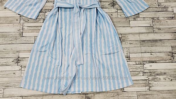 Жіночий халат на запах середньої довжини виготовлений з натуральної бавовни. Виріб у біло-блакитну смужку має рукави три чверті та пояс у комплект. Тканина м´яка та приємна до тіла.р.S