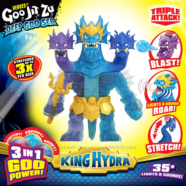 Пориньте в морські дійства разом з володарем Короля Гідри Deep Goo Sea! Чи зможе він перемогти злих лиходіїв, чи цунамі битв, наповнених слизом, буде нестерпним?На відміну від інших героїв Goo Jit Zu, Король Гідра має 3 різні наповнювачі, що робить його тіло надзвичайно еластичним, надзвичайно м’яким і надзвичайно липким! Діти відчують його силу у своїх руках, розтягуючи та стискаючи його три різні слизові начинки!