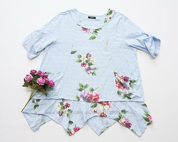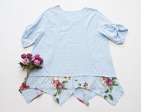 Выглядит так, что глаз не отвести, цвета голубого летнего неба, в очаровательный яркий цветочный принт. Ткань натуральная дышащая, очень приятная к телу, крой свободный фантазийный, рукава широкие с подхватами. Вещичка акцентная, "вытянет" из скуки любой образ и сделает его заметным.