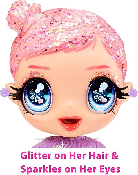 Куколки MGA Glitter Babyz - это блестящие, красивые, волшебные малышки с большими красивыми глазами, блестками на ресницах и блестками в волосах.У каждой куколки Глиттер Бебис свой уникальный стиль. У Marina Finley морской стиль.