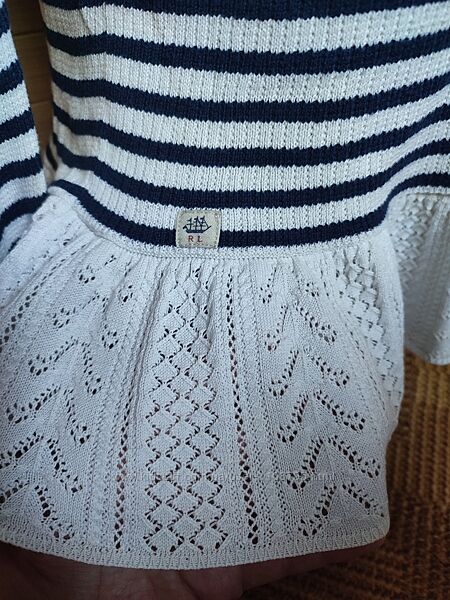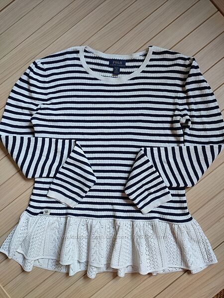 якісний лонгслів/кофта у смужку із кружевною баскою від "Polo Ralph Lauren"/пишуть розмір на 16років, також підійде на дорослий XS/36-38рр - річ б/у - стан дуже гарнийколір: білий + синій/смужка