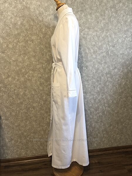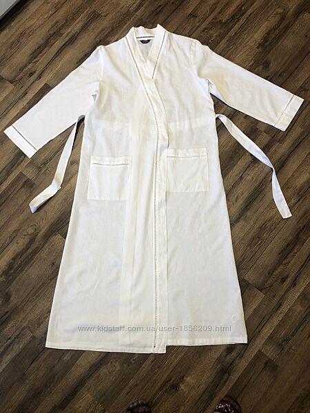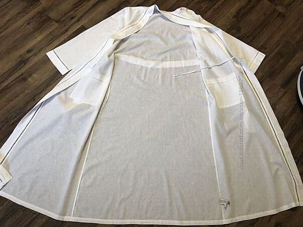 Дуже класний халат,новий,але без етикетки.Виробник Шрі Ланка,склад тканини 55% льон+45% віскоза (на вигляд і дотик як бавовна),розмір вказано 10,реальні заміри:довжина по спині 127см,