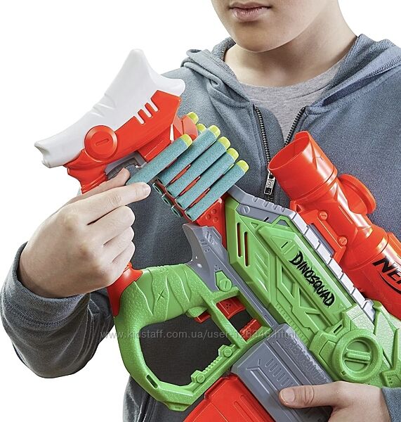 Nerf DinoSquad Rex-Rampage Motorized Dart BlasterNERF DINOSQUAD REX-RAMPAGE BLASTER: вирвіть у бій із потужністю Ті-рекса за допомогою цього бластера, який містить дивовижні деталі динозаврів, які передають вигляд динозавра тиранозавра Рекса.