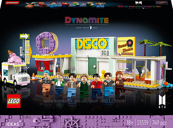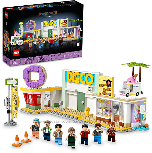 Спіймайте радісну енергію поп-ікон 21-го століття RM, Джина, Шуги, Джей-Хоупа, Чіміна, Ві й Чонгука з допомогою набору LEGO Ideas BTS Dynamite (21339), що створений за музичним кліпом. Відшукайте свою будівельну звичку, щоб відтворити яскраві моменти з кліпу на мультиплатиновий сингл Dynamite, зі сценами дискотеки, крамниці з платівками, крамниці пончиків, фургону з морозивом й інших деталей, що створені з кубиків. Додайте мініфігурки LEGO учасників гурту в різних місцях або розмістіть їх усіх на спеціальній сцені і крутіть колесо, щоб побачити, як вони танцюють.Так само, як і у відеокліпі Dynamite