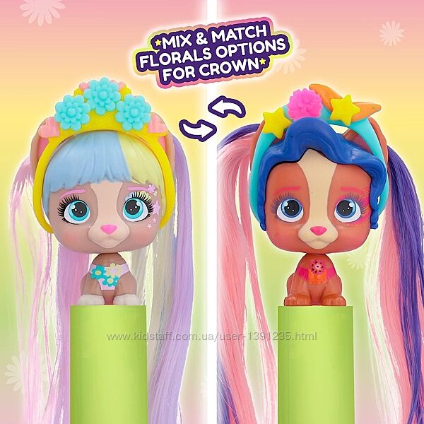 Mini Fans Spring Vibes - це колекція з +12 міні-персонажів на тему кольорів. Як і їхні кумири, вони поділяють пристрасть до зачісок і дотримуються квіткової тенденції.Волосся 20см ідеально підходить для розчісування та прикраси їх квітами. Вони поставляються у новій капсулі з шампунем з особливою квітковою кришкою!