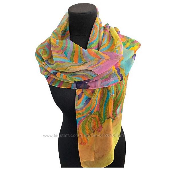 Шовковий шарф з натурального шифону багатий своїми відтінками. Життєрадісне забарвлення з переходами від зеленого до блакитного, жовтого і помаранчевого, нагадуватиме вам про прекрасні літні дні. Шовк шифон надзвичайно легкий і затишний матеріал, оскільки у своїх волокнах утримує тепло, незважаючи на свою легкість і прозорість і, навпаки, освіжає в спекотний літній день прохолодою.Розмір шарфа 142 см на 40 см.
