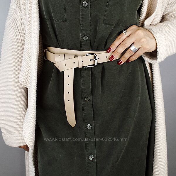 Хочете завжди бути у центрі уваги? Чи любите приковувати до себе погляди перехожих? Тоді цей аксесуар точно для вас! З ременем, що обертається навколо талії в 2 рази – ви точно будете у тренді. Адже з ним ваш образ буде стильним, оригінальним і завжди різним. Подвійний ремінь можна зав´язати декількома способами: на 1 вузол, на 2 вузли або класичним способом, просунувши ремінь у шльовки сукні або штанів. Завдяки великій кількості дірочок у вас завжди буде вибір. Його можна носити і під сукні, і верхній одяг, кардигани, піджаки, джинси. Він скрізь знайде своє місце, стане родзинкою у кожному образі та зробить гарний акцент на талію. Матеріал – натуральна гладка шкіра бежевого кольору. Ремінь складається з 2 смуг шкіри, з´єднаних кільцем. Дірочки по всій довжині другої половини ременя. Пряжка із темного металу. Довжина ременя є різна: 170-200 см, ширина 2,4 см. При необхідності розмір поясів можна зменшити. Наші менеджери менеджери допоможуть вам підібрати необхідну довжину. Для цього вам потрібно знати лише ваш об´єм у талії. Ця модель також є в інших кольорах. Країна-виробник - Україна. Упаковка – крафтова коробочка.