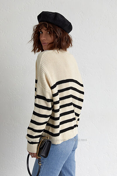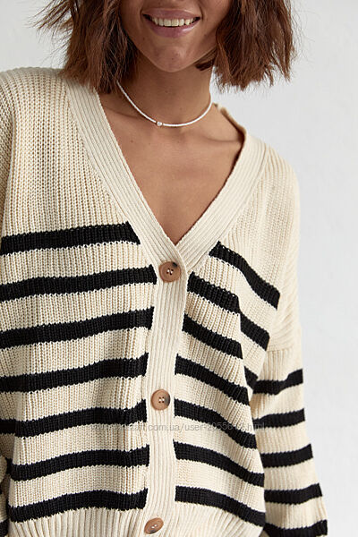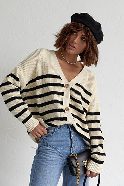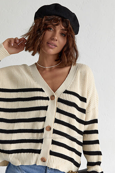 Ця модель повністю прикрашена горизонтальними смужками і спереду застібається на три гудзики. Горловина у виробі V-подібна, лінія плеча подовжена. Краї прямого низу та довгих рукавів закінчуються однотонною в´язкою у вигляді високих манжет. Також рукави по краях доповненівшитою резинкою.