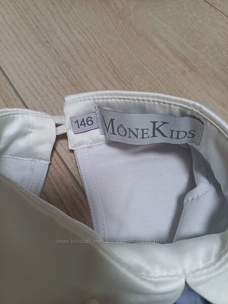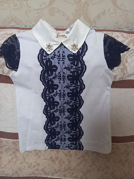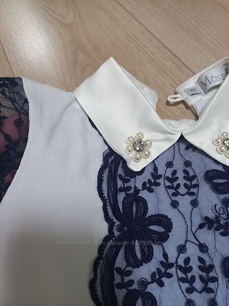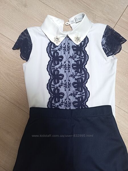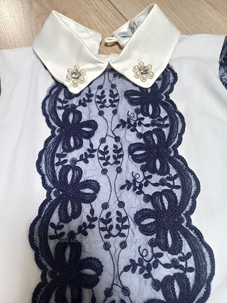 Нарядная блузка с коротким рукавом для девочки из школьной коллекции "Mone kids". Цвет белый с синими вставками, атласный воротник-украшенный камушкамими и жемчужинами. Спереди и рукава украшены французьким кружевом. Размер указан 146. Мы одевали раньше в первый класс. Состояние отличное. К блузке есть жакет, юбки, туфли, сарафан (смотрите в объявлениях).Без возврата