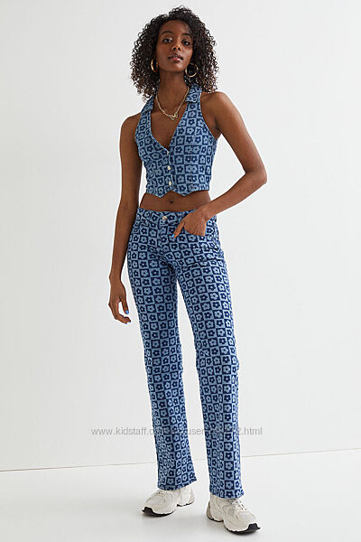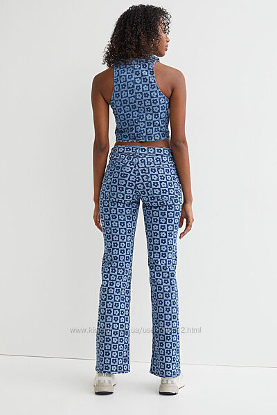 Джинси H&M у квітковому геометричному принті.З п´ятьма кишенями та із середньою посадкою із злегка еластичного бавовняного деніму із ширинкою на блискавці та гудзику та широкими розкльошеними штанинами.