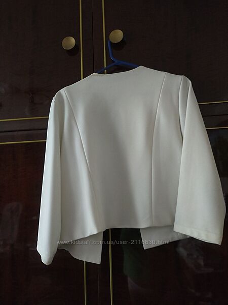 Білий жакет, трикотаж новий розмір український на 46-48, европейський розмір 42, з підкладкою. Матеріал 90% хлопок і 10% еластин, не минеться, гарно носиться.Торгу, повернення, обміну немає. Відправляю після предоплати.
