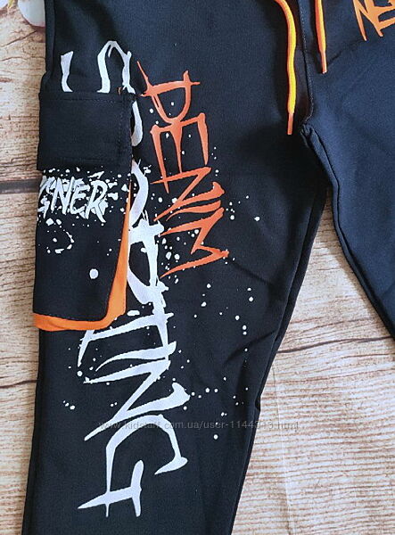 Спортивні штани на хлопчика на зріст від 134 до 164.Талія та низ вироби на широкій резинці. Наявність 2 кишені спереду та однієї об´ємної, накладної кишені збоку.