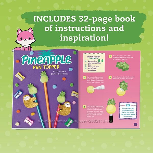 Налаштуйтеся на успіх і перетворите будь-який простір на творчий рай! Зробіть 4 фантастичні насадки для ручок/олівців (ручки не входять до комплекту), включаючи пухнастого друга-лисицю, пухнасту лапу, лінивця та ананаса, а також екстрагентну блискучу ручку з чарівною паличкою. Зберігайте свої ручки в райдужному тримачі для ручок своїми руками та прикрашайте наклейками. Занотуйте свої найкращі ідеї в блокнот на 40 аркушів із милим малюнком і збережіть своє місце закладкою, яку ви зробили самі. Зберіть табличку, щоб нагадувати всім, що #KidBoss у домі!