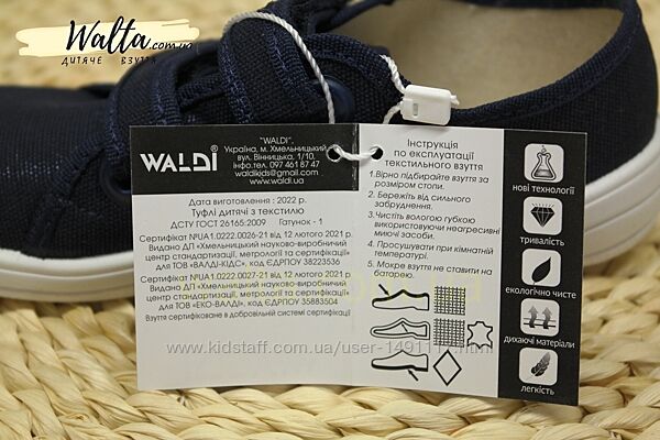 Зовнішня поверхня взуття та підкладки виготовлена з натуральних тканин, що «дихають». Модель дизайн створений конструкторами, технологами, докторами-ортопедами. Все більше мам віддають перевагу саме тапочкам «WALDI». Відмінний варіант для школи, садка або прогулянок навесні, влітку, восени на відкритому повітрі.