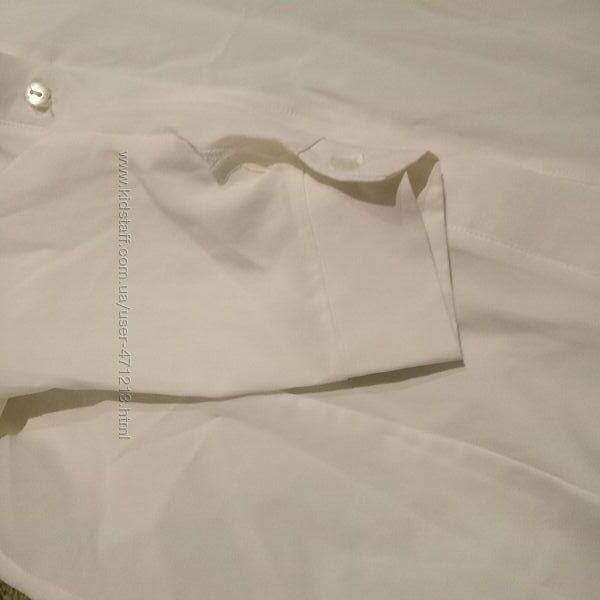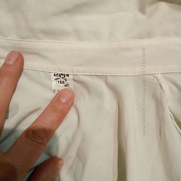 Блуза для дівчинки, розмір 158. Колір білий (теплий з жовтинкою). Без нюансів. Тканина - поліестер, легкий, приємний. На гудзиках, спереді жабо, яке тримається на двох гудзиках, відстібується.