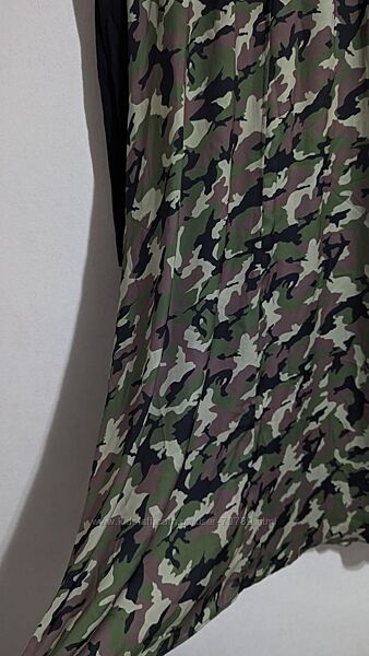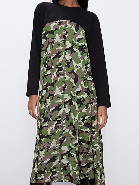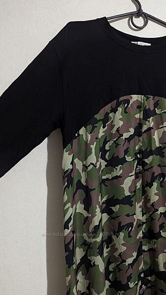 Стильное платье Zara Зара миди размер L. Платье с круглым вырезом и длинными рукавами. Состоит из двух частей - чёрный хлопковый топ с круглым переходом в камуфляжный низ свободного кроя. Состав: черная ткань 100% хлопок милитари 100% полиэстер. Замеры: Длина по спинке - 121 см ПОГ - 48-50 см Рукав - 60 см ПОБ - 70 см Цвет: Чёрный, Хаки