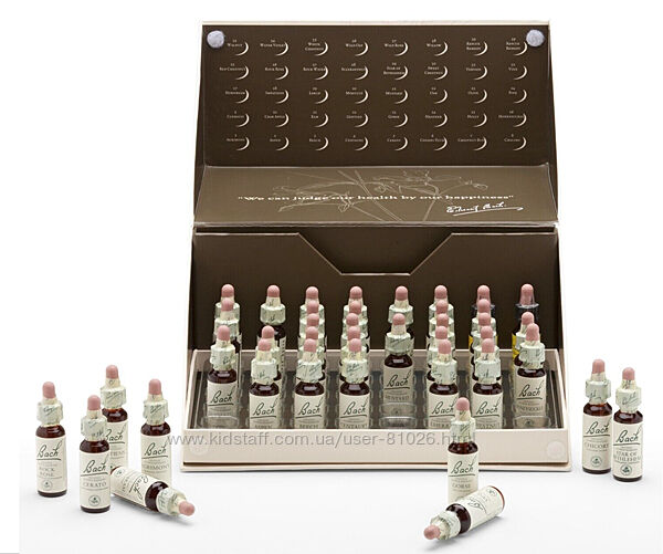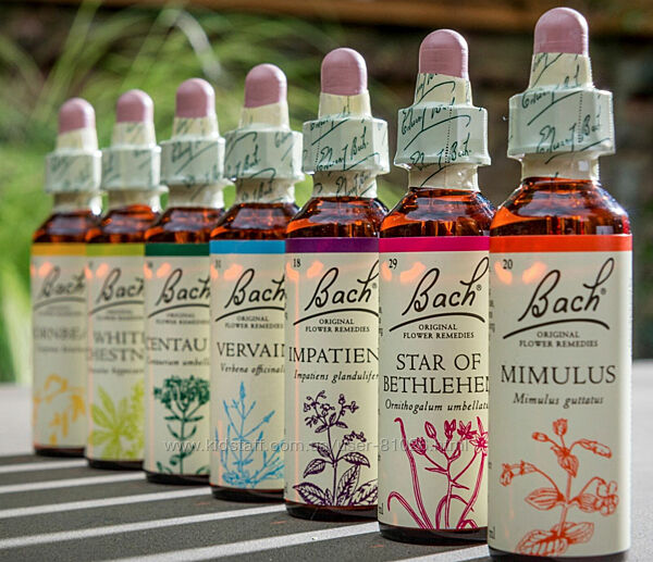 З оригінальними квітами Баха: реп´ях, осика, бук, золототисячник, церато, алича, нирка каштана, цикорій, клематис, яблуня, в´яз, тирлич, утісник, верес, гостролист, жимолість, граб, недоторка, модрина, мімулус. , Дуб, Олива, Сосна, Червоний каштан, Кам´яна троянда, Кам´яна вода, Склерантус, Вифлеємська зірка, Запашний каштан, Вербена, Виноградна лоза, Волоський горіх, Водяна фіалка, Білий каштан, Дикий овес, Дика троянда, Верба