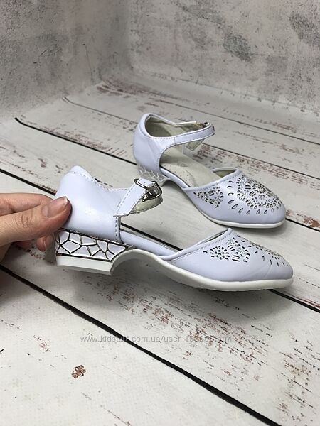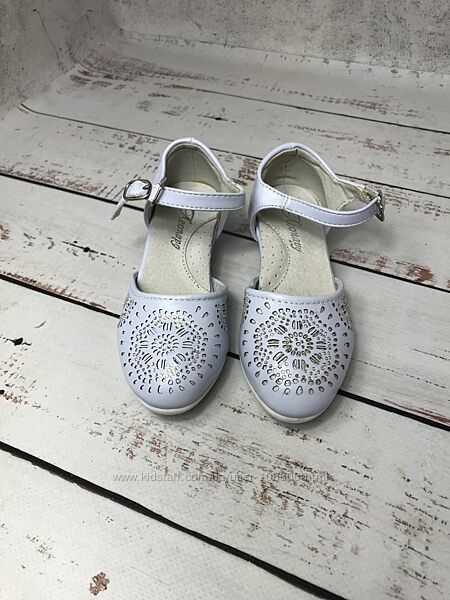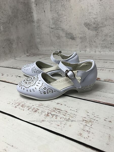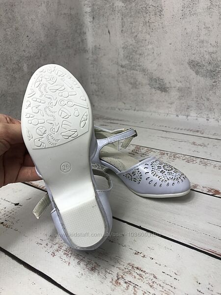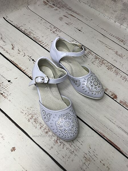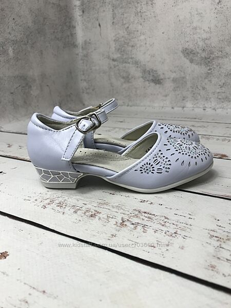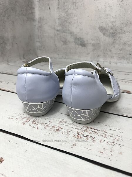 Верх туфель виконан з сучасної штучної шкіри ніжного блакитного кольору з перфорованим візерунком та камінцями в якості декоруВсередині також штучна шкіра та устілка з якісної натуральної шкіри, яка забезпечує додатковий комфорт