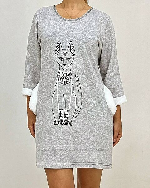 фото 4-8 Жіноча тепла туніка "Сфінкс" з тканини футер начьос (баєчка). Тканина натуральна та приємна до тіла, малюнок - якісний шовкотрафаретний друк, края обшиті кантом. Туніка з двома внутрішніми кишенями, края їх та рукавчик декорований махровою опушкую. Стильна та натуральна підійде як для сну так і як улюблений та теплий домашній одяг.