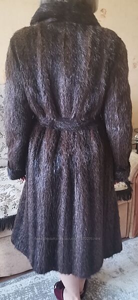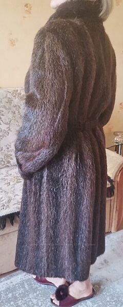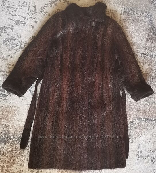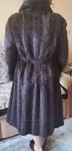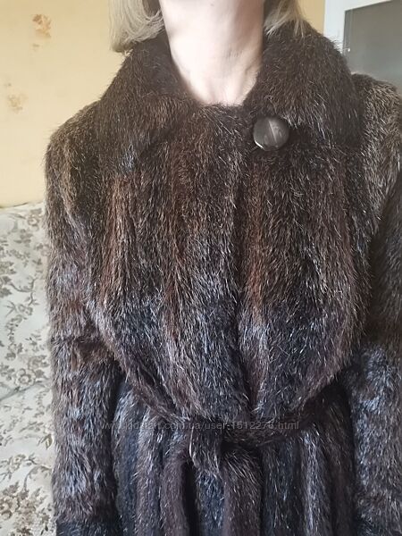 Шуба з натурального хутра нутрії. Трапецієвидного довгого крою, на поясі. Можна носити як з поясом, так і без поясу. Коричневого кольору. У відмінному стані, незначні потертості на внутрішньому боці манжети та на поясі (додаткові фото скину за потреби у приват). Всі застібки та гудзик цілі та справні. Розмір М (44-46). На зріст 163 см - значно нижче колін (на фото). На підкладці - принт "Valentino".Довжина - 110 см.