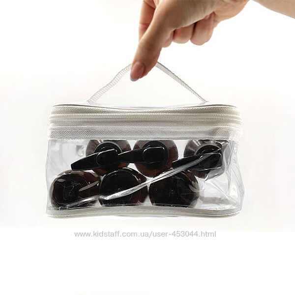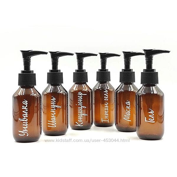 В набір входить 6 пластикових диспенсерів по 100 мл та прозора косметичка.Розміри дозатора: