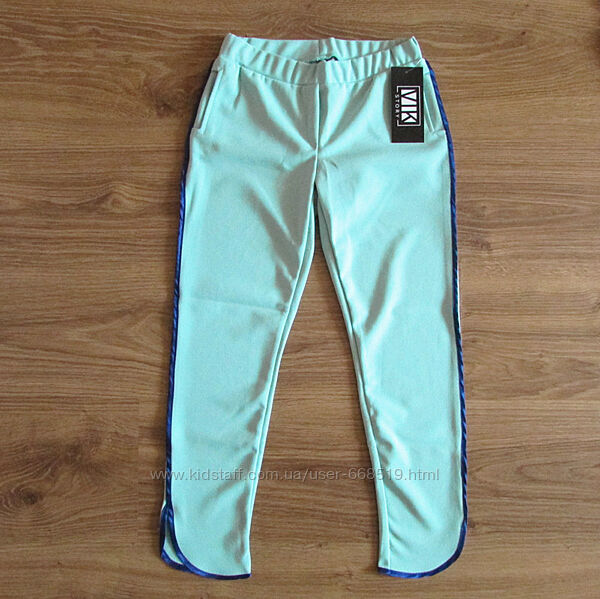 Легкі літні брюки-лосини з лампасами для дівчинки. Колір блідо-зелений (салатовий).Матеріал – креп-дайвінг. Добре тягнуться. На поясі зручна гумка. У бічному шві є кишеньки. Якісні штани, виробництво – Україна.