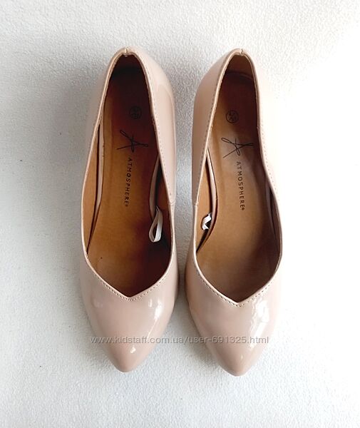 Пропоную бежеві лакові туфлі з штучної шкіри, від Atmosphere. Уживані пару раз акуратно, стан загалом дуже добрий, але є подряпини, дивіться фото.Розмір вказано 4/37. Довжина устілки всередині 23,7 см, ширина 7,5 см, каблук 10 см.