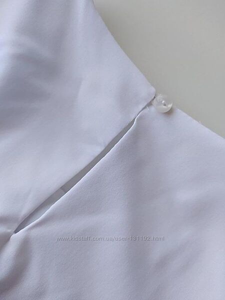 Пропоную нову білу ошатну блузку.Польща Трендовий комір з синьою вишивкою і маленький бантик Ззаду застібається на гудзик Розмір вказаний 152 см Але ,завдяки фасону можна одягати раніше Довжина 55-56 см Рукав-53 см Плечі 33,5 см, НОГ 42 см Тканина поліестер,трохи тягнеться