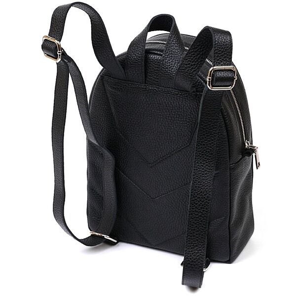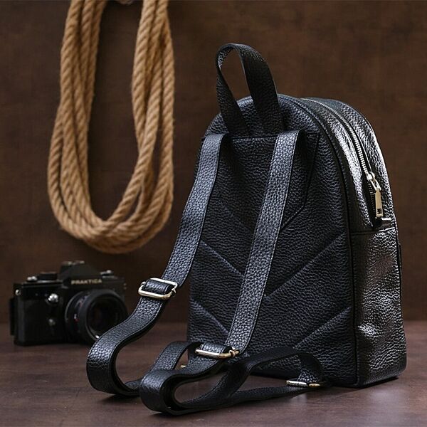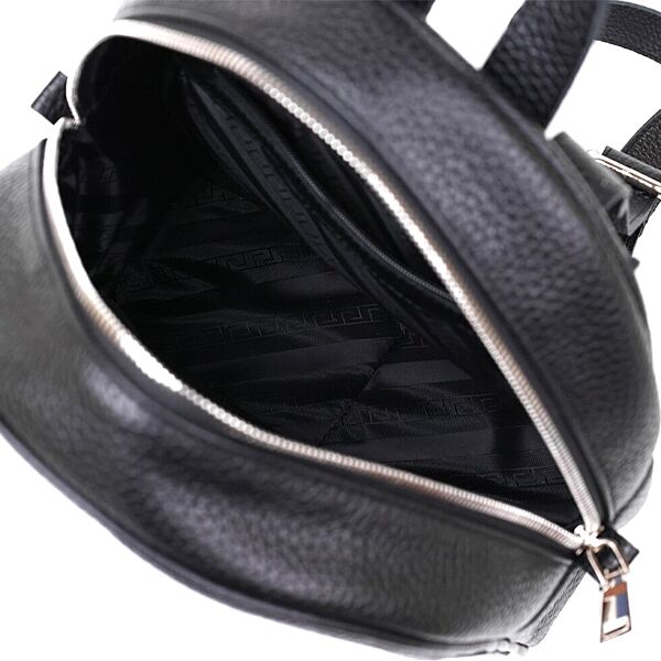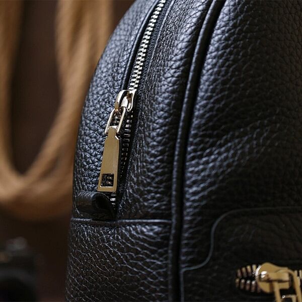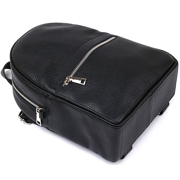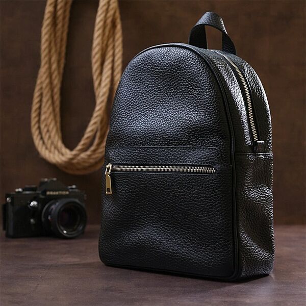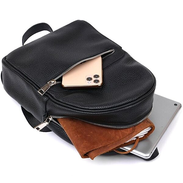 Практичный женский рюкзак из натуральной кожи высокого качества исполнения. Имеет зернистую фактуру и универсальный черный цвет, поэтому подойдет под любую одежду. Основное отделение очень вместительное и просторное, на внешний стороне предусмотрен небольшой карман на молнии.