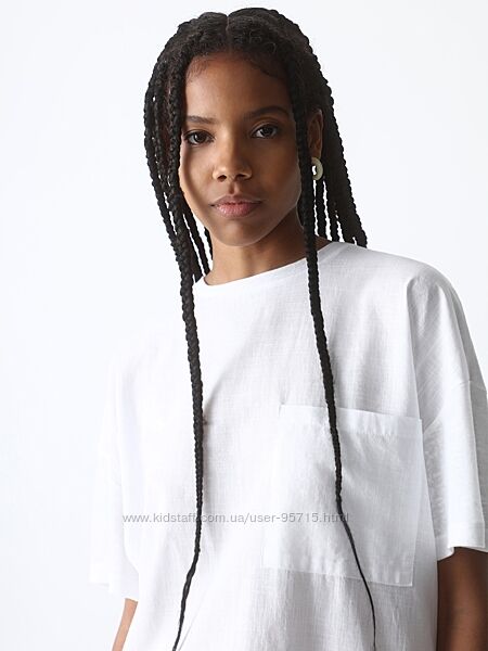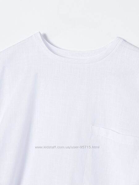 Свободная футболка с коротким рукавом, круглым вырезом и нагрудным карманом. Изготовлены из разных фактур и тканей. Передняя часть выполнена в деревенском стиле, а задняя часть выполнена из удобной ткани с эффектом льна.