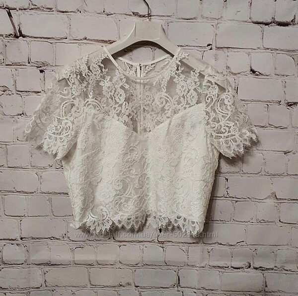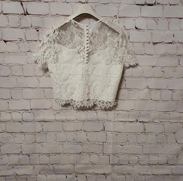 Укороченный кружевной топ с круглым вырезом и короткими рукавами. Планка на пуговицах с обтянутыми пуговицами сзади и зубчатыми краями на манжетах и по низу. Частично на атласной подкладке.Полиамид 65%, Полиэстер 35%Подкладка: Полиэстер 96%, Эластан 4%