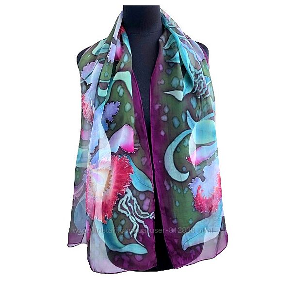 Такий авторський шарф підійде для будь-якого сезону, адже шовк реагує на шкіру людини на молекулярному рівні: зігріває взимку і приємно охолоджує спекотним літом.