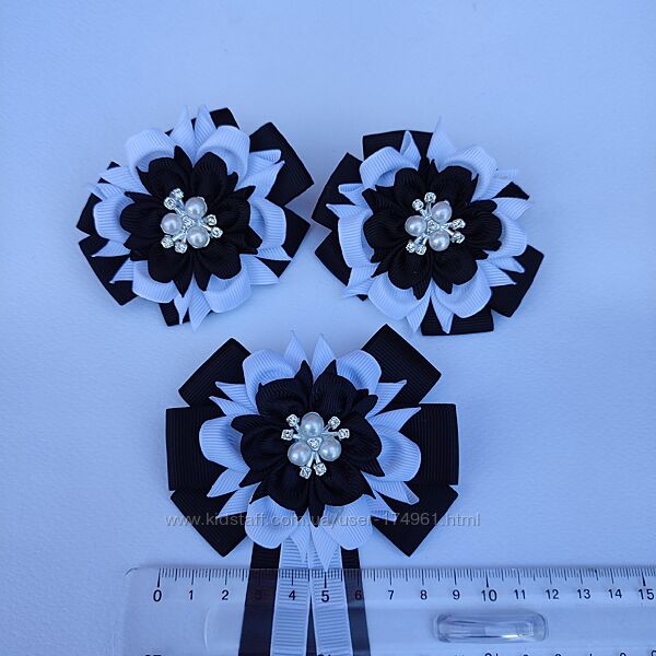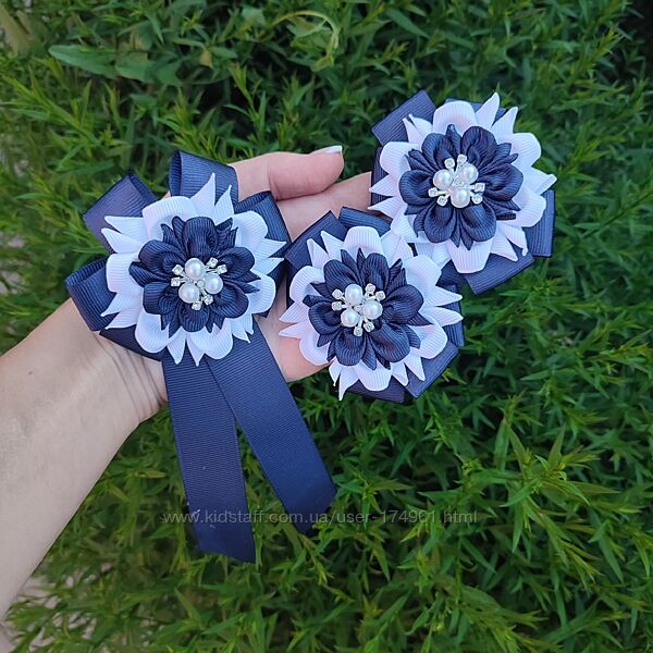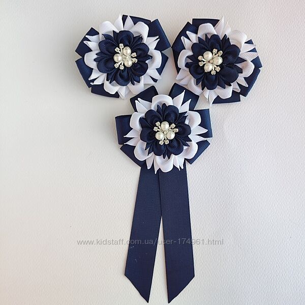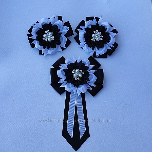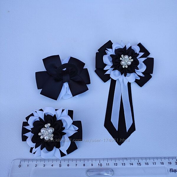 Комплект в школу - бантики на резинках та галстук краватка брошка в біло - чорних або темносиніх кольорах. Створений з репсової стрічки, прекрасно тримає форму, не мнеться. Ціна 350 грн В наявності Перешлю УП, НП